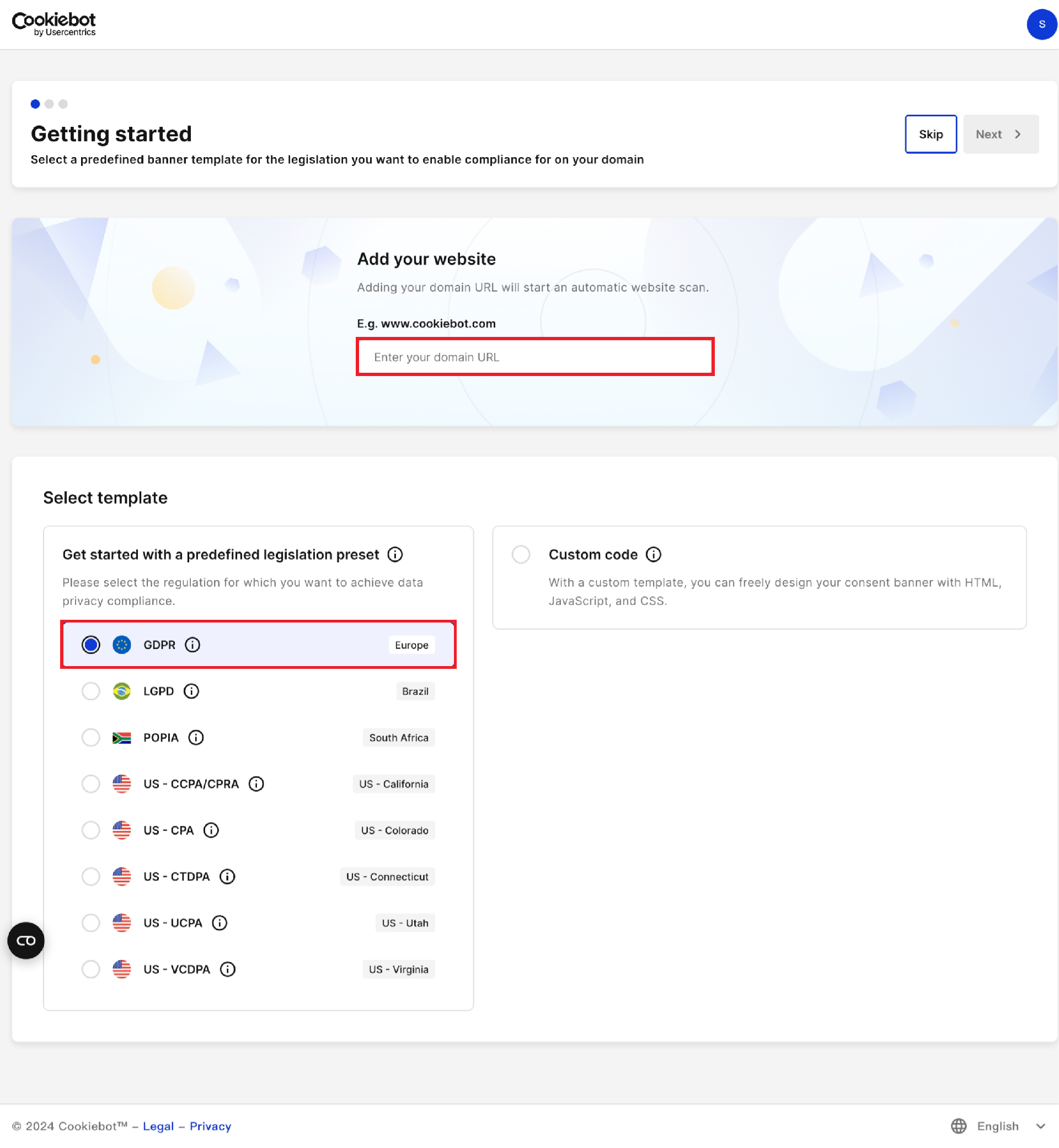 填寫您代配置的網(wǎng)站域名URL;選擇法規(guī)模版為”GDPR“,點擊NEXT以完成后續(xù)步驟;