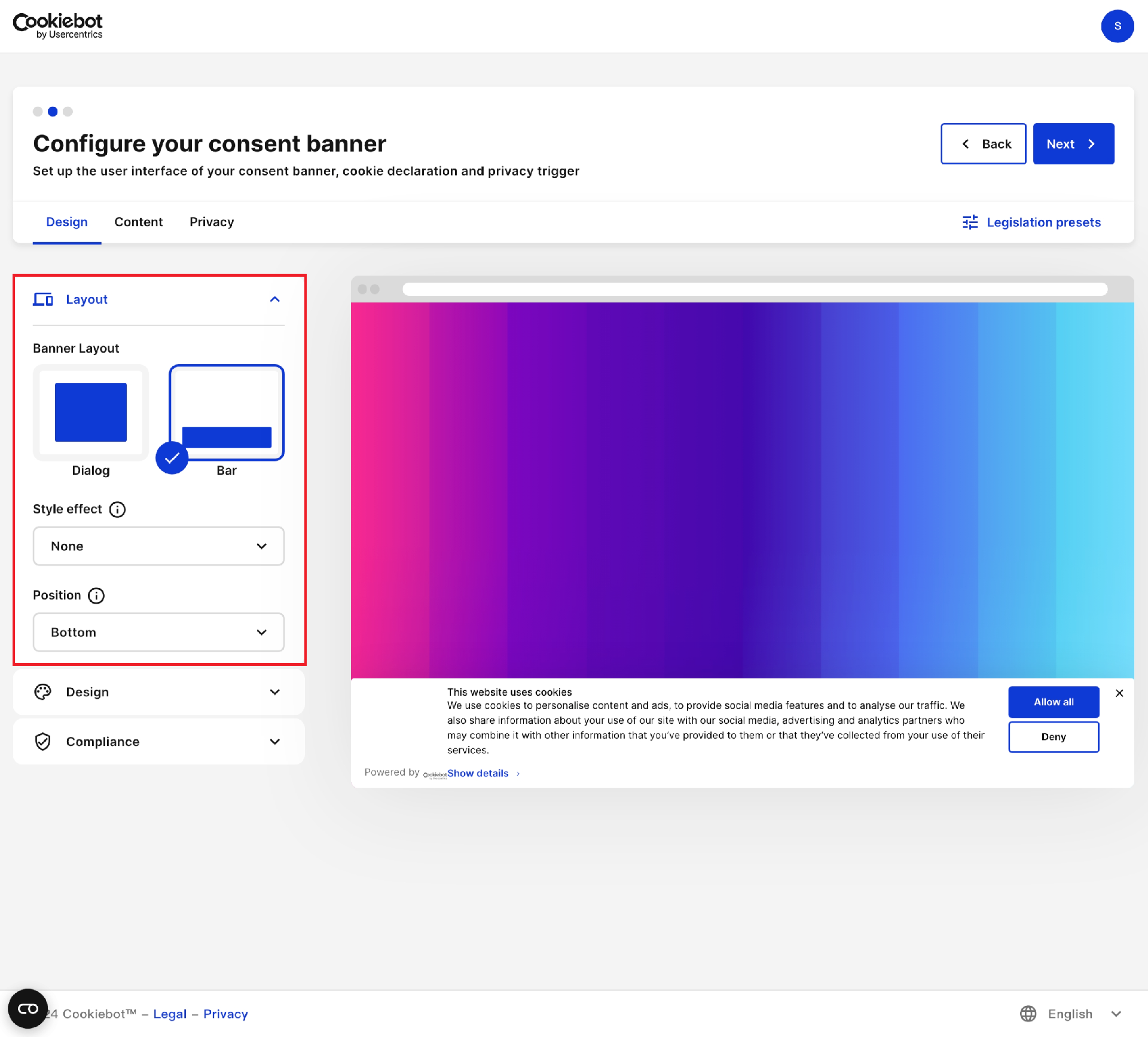 如果您不希望所有國家的網(wǎng)站訪客都收到此 CMP Banner,則您可以在Cookiebot中按圖示進行設(shè)置,點擊”Configuration“按鈕,進入Design界面;