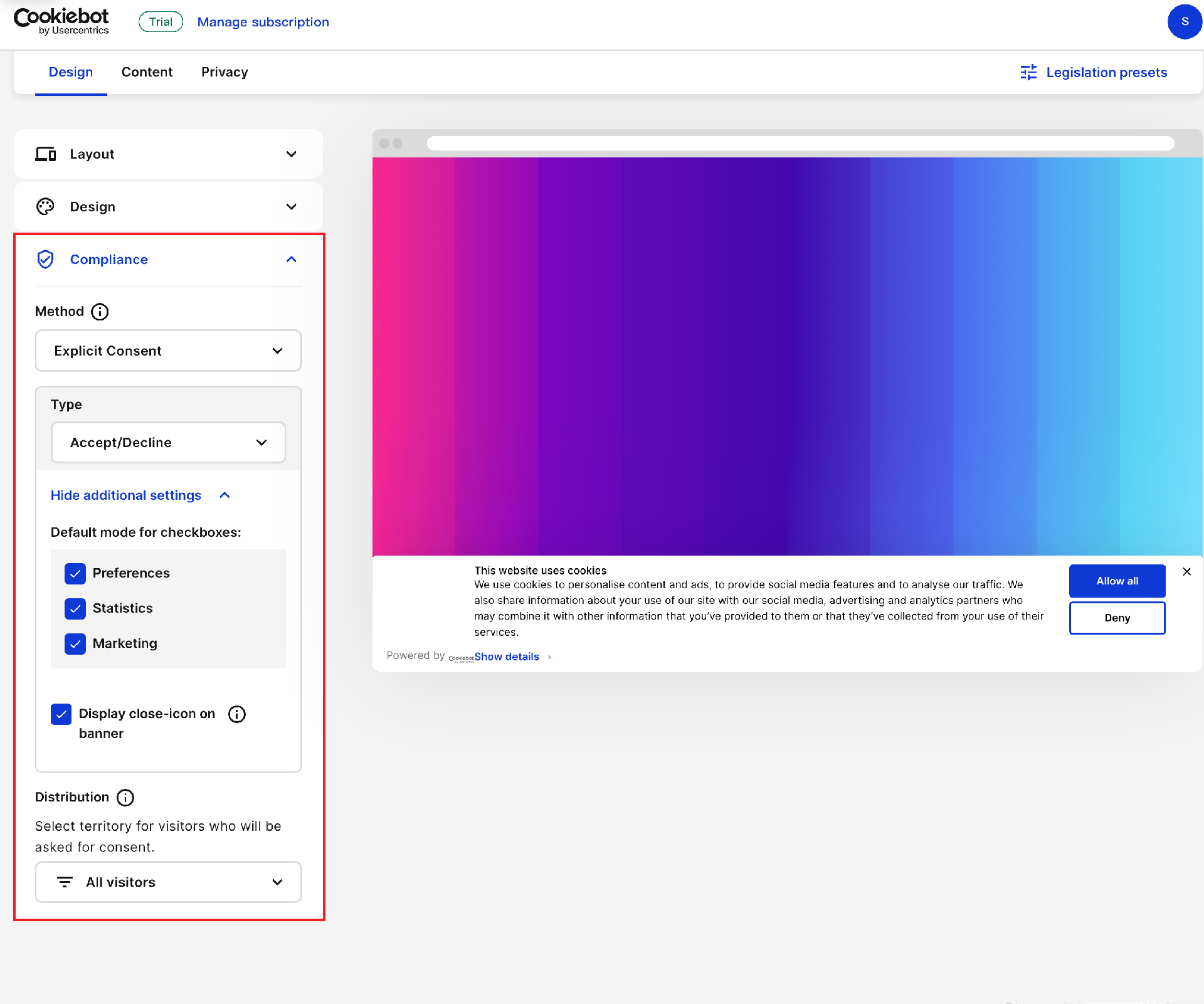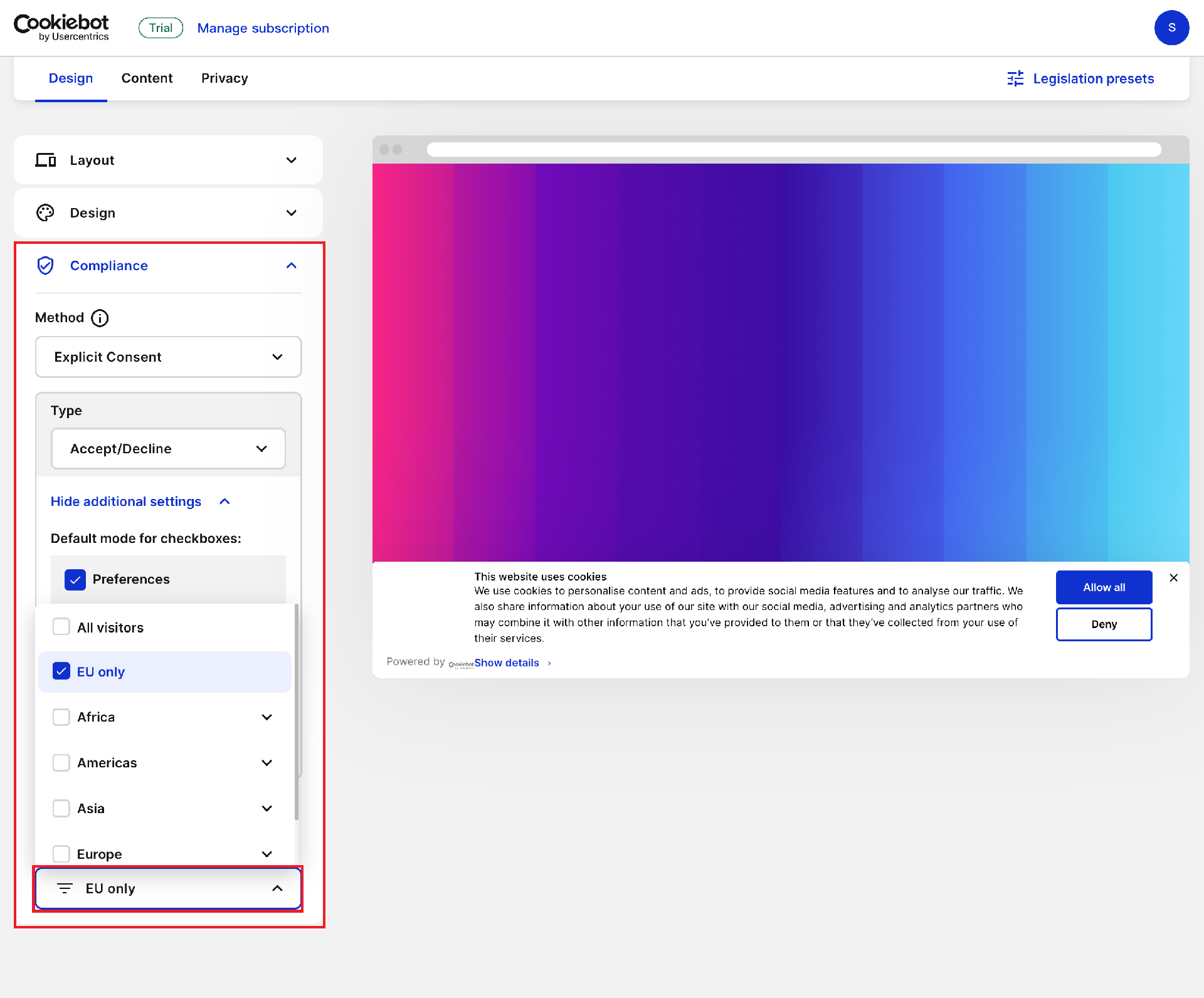 在”Compliance“欄的”Distribution“,將選項”All visitors“修改為”EU only“