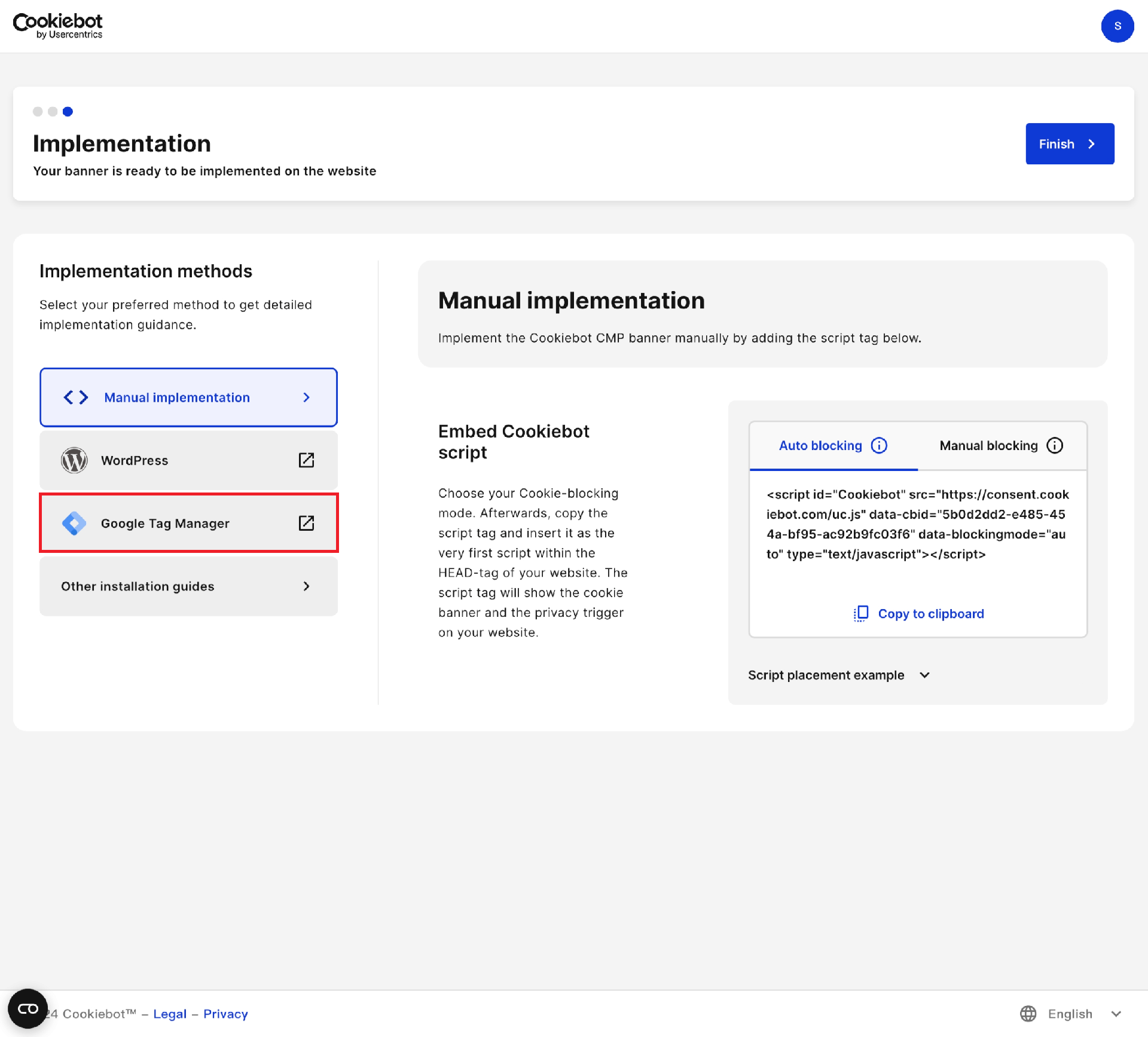 上述步驟處理完畢后,接下來將接入到CMP部署環(huán)節(jié);目前我們推薦您使用Google TagManager方式將CMP代碼部署到網(wǎng)站中,此方式方便后續(xù)集中管理應(yīng)用在網(wǎng)站中的代碼;