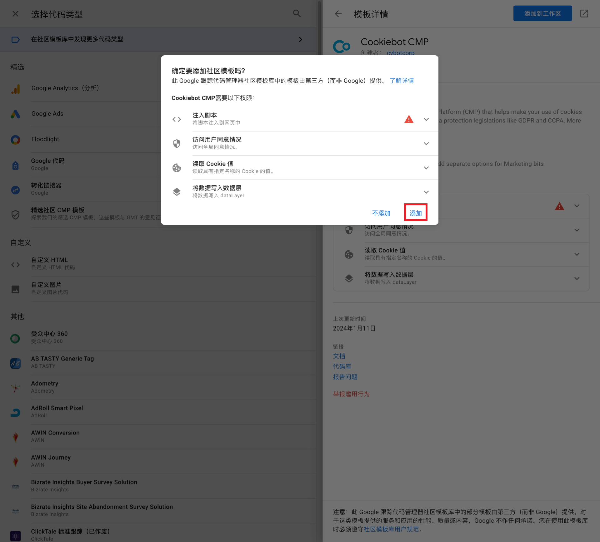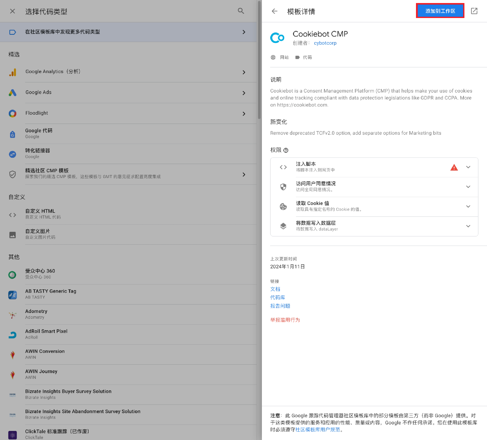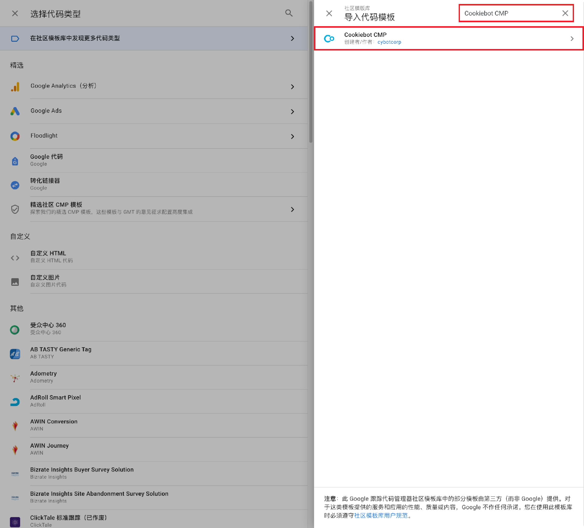 (4)在“導(dǎo)入代碼模版”側(cè)邊欄中,搜索“Cookie CMP”,并點擊搜索結(jié)果;