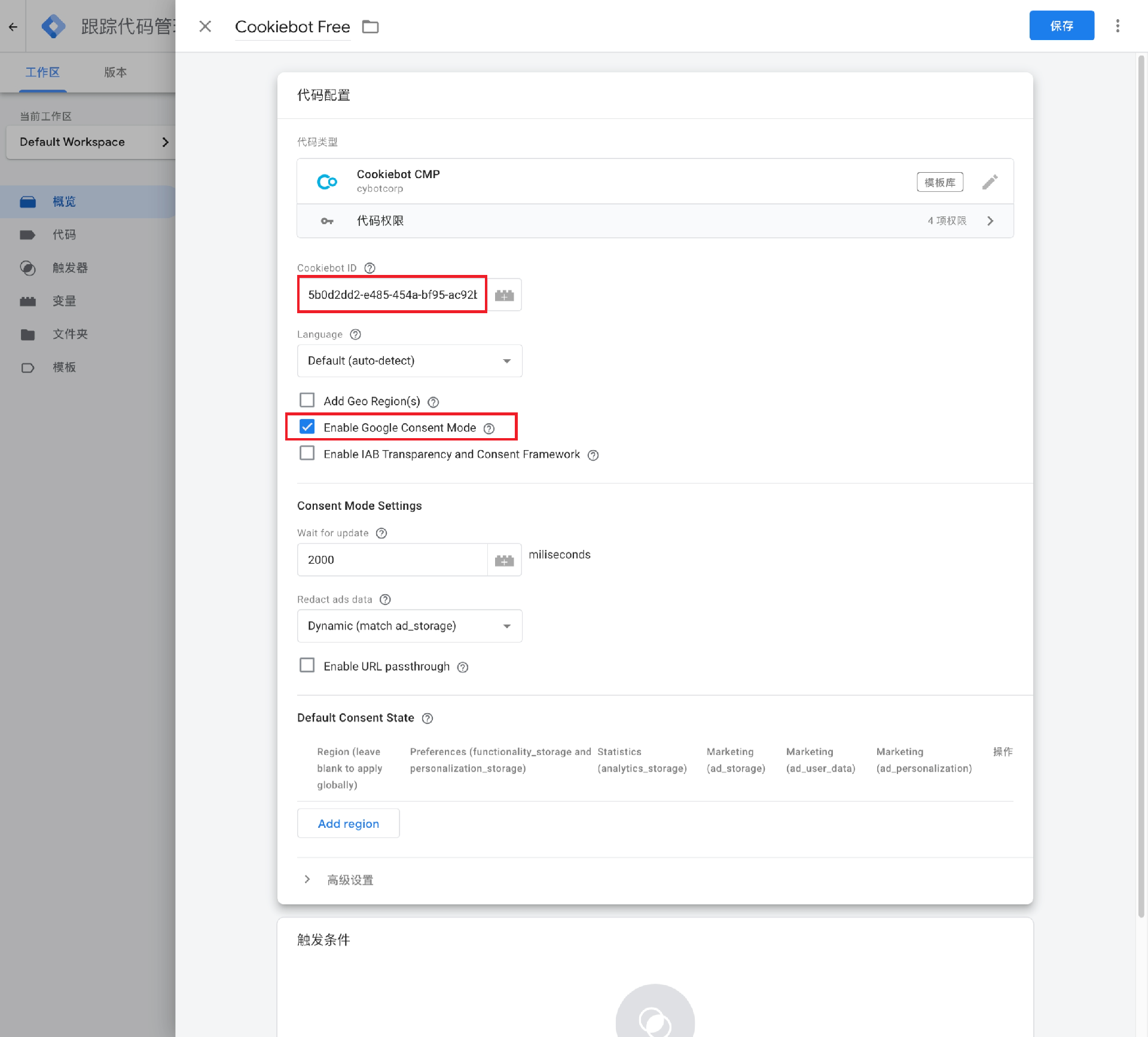 (7)在代碼配置中填寫關(guān)鍵信息并配置Consent Mode;