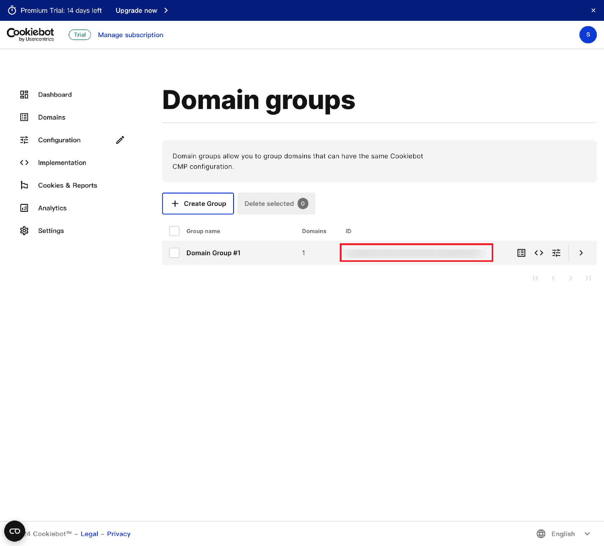 訪問 https://admin.cookiebot.com/domain-groups , 在包含您待配置的域名分組中,復(fù)制ID回填至GTM;